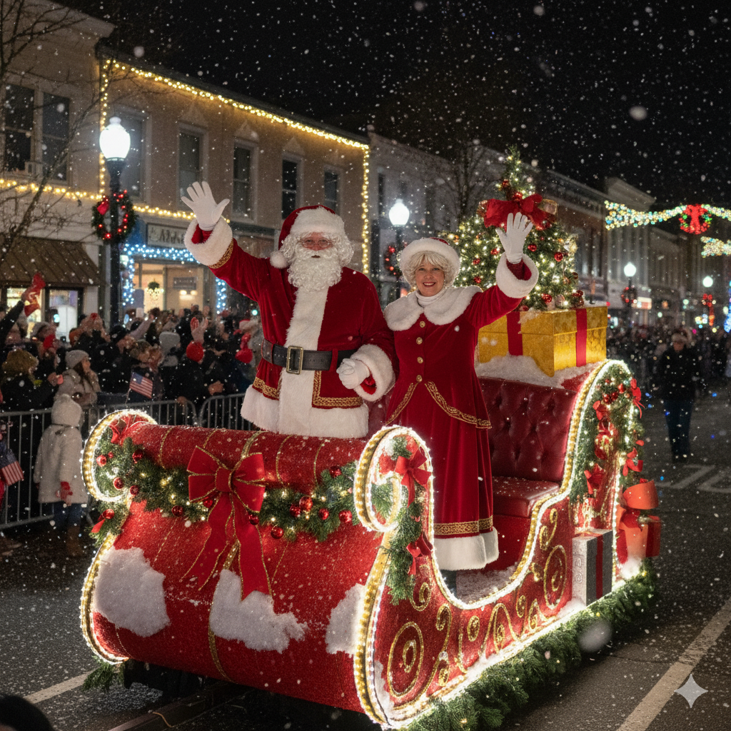 The Santa Claus Parade rolls down Princess Street — bands playing, lights bouncing off limestone, families bundled tight against the cold.
